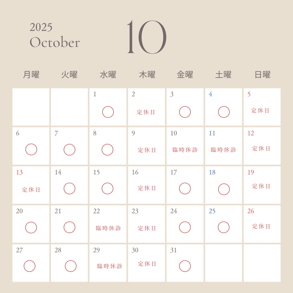 10月10、11、22.29日は臨時休診になっているため、ご注意ください。
