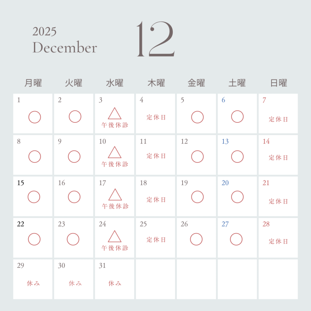 12月3、10、17、24日の午後は臨時休診になっているため、ご注意ください。午前中は診察しております。